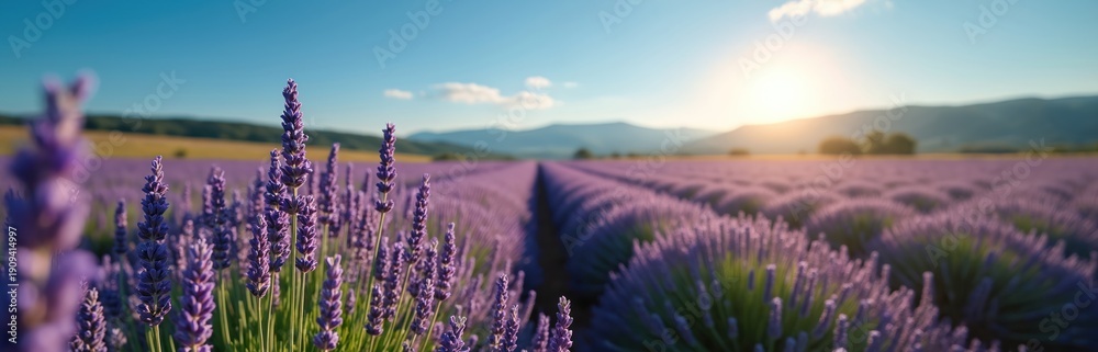 • Field of purple lavender flowers under blue sky with sun. Endless rows of blooming plants stretch to distant hills. Natural landscape with fragrance and beauty.