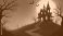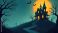 • Spooky mansion on hill under large orange moon with bats flying near dark bare trees. Pathway leads up to glowing windows of haunted house at twilight.