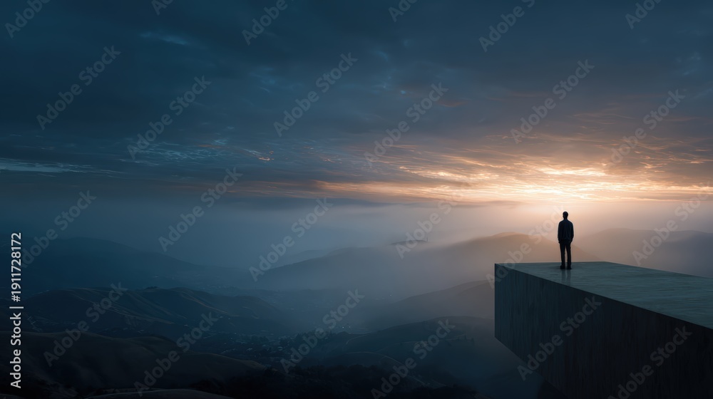 Obraz Pejzaże - Man standing on sturdy platform overlooking vast landscape symbolizing brand's distinct and... #1911728172