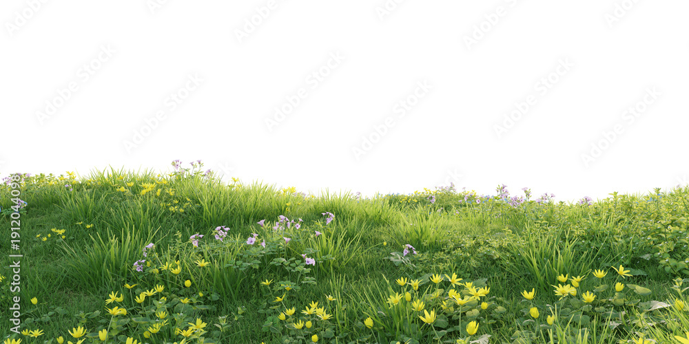 • Verdant Hill Blooming with Yellow Flowers in Spring. 3D render.