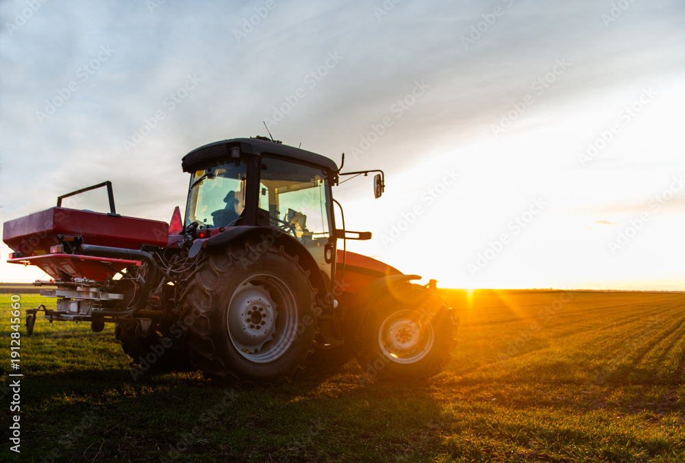 Obraz Pejzaże - Tractor spreading artificial fertilizers in field #1912845660