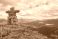 • Stone inukshuk marker on rocky mountain summit with scenic view of forest valley and distant lakes