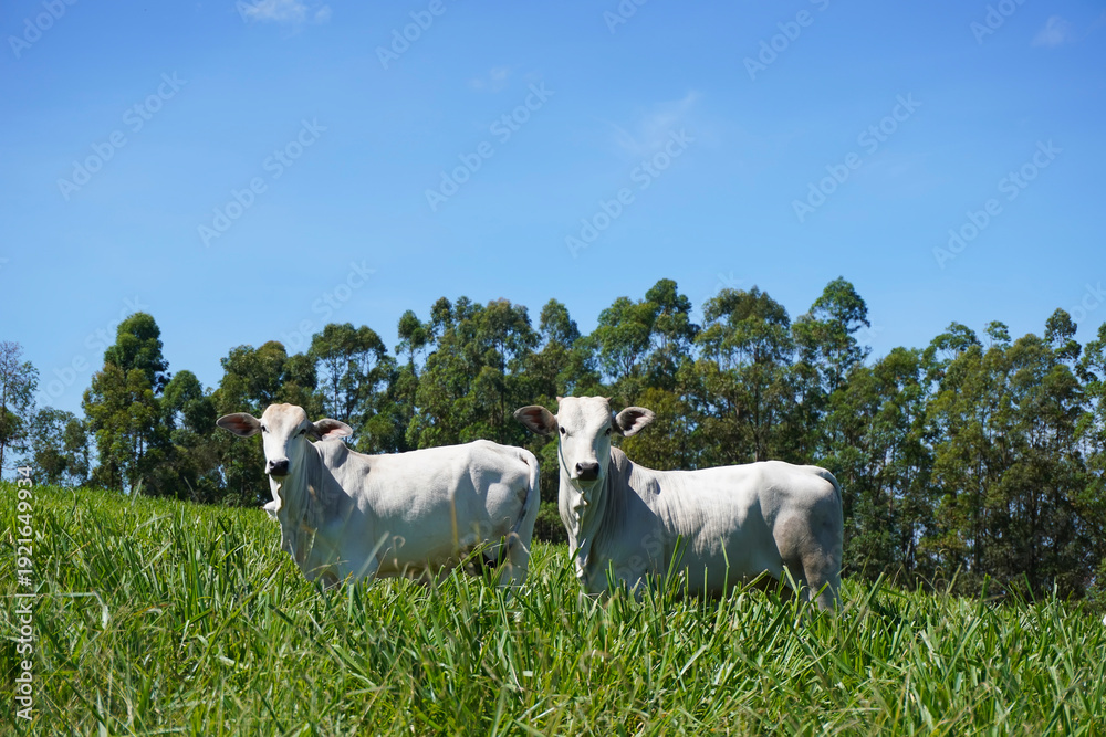 Obraz Pejzaże - White Cattle Grazing Peacefully in Lush Green Pasture #1921649934