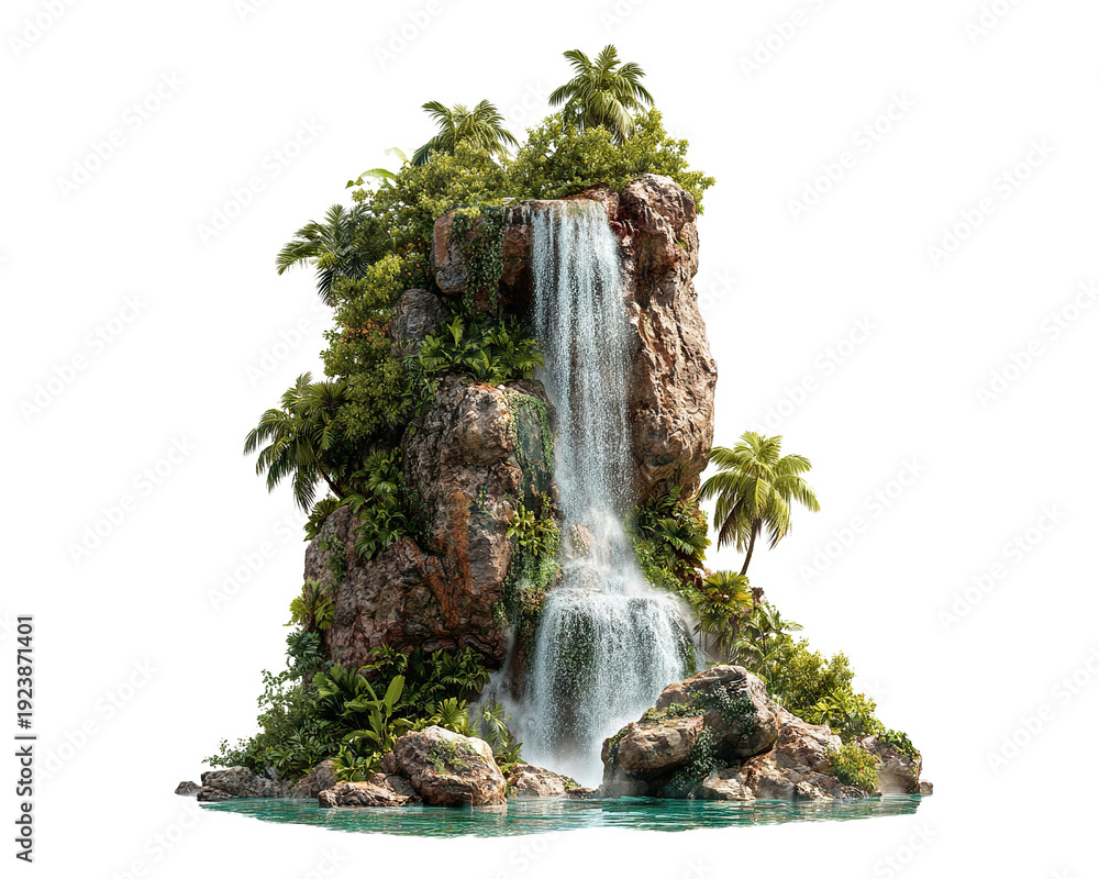 • Tall tropical waterfall cliff with palm trees, isolated on transparent cutout background