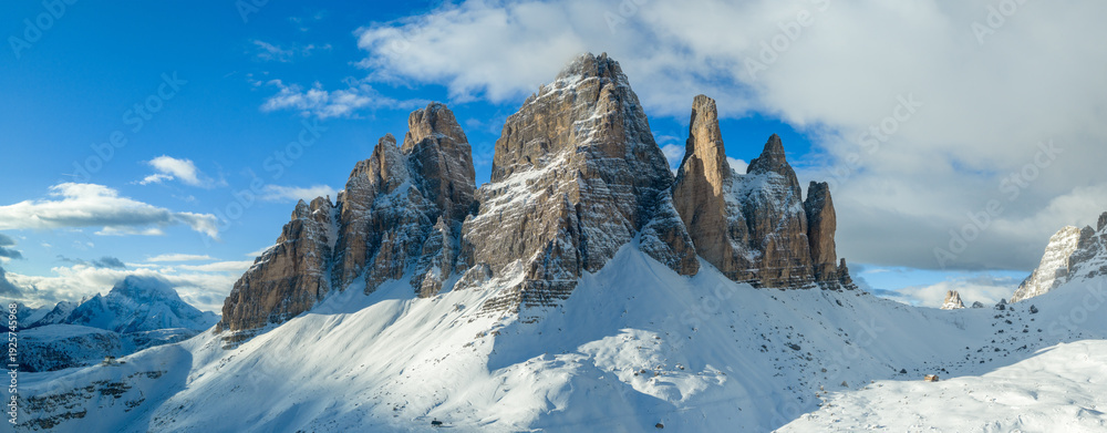 • Beautiful Panorama of Tre Cime di Lavaredo in Dolomites Mountains During Winter