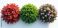 • Three bushes arranged in a line show variety. One has bright red leaves and small star-shaped flowers. Another is full of lush green foliage. The third bush has abundant pink blossoms.