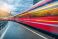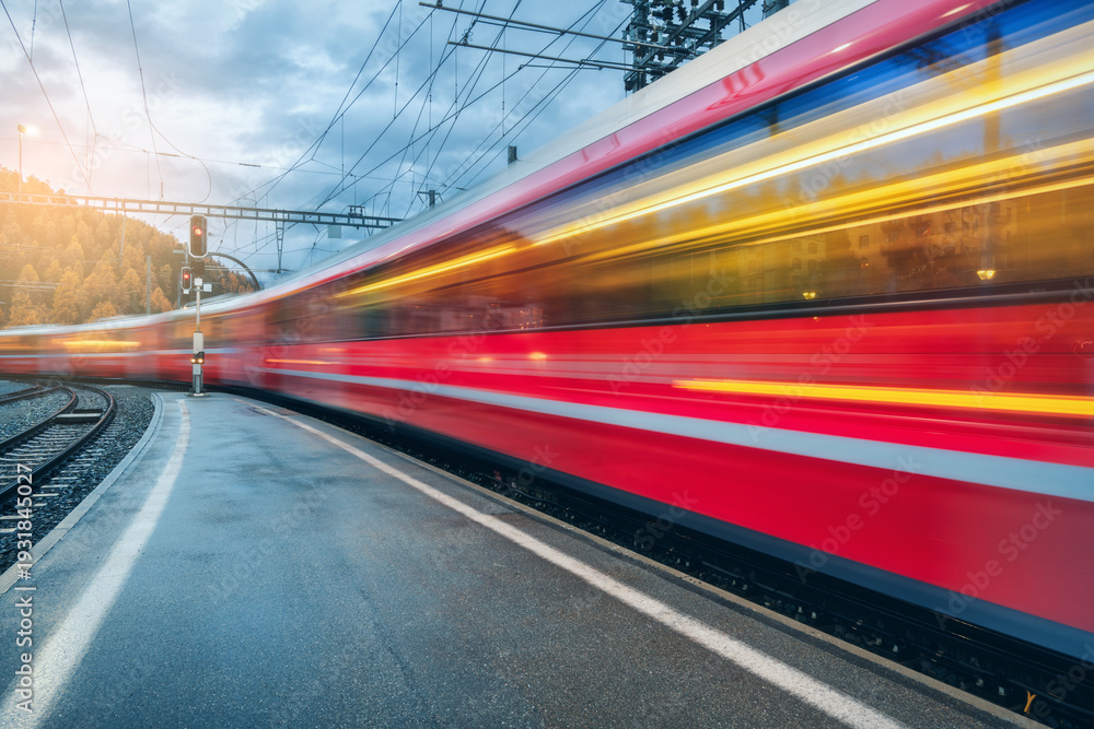 Obraz Pejzaże - Blurred red passenger train passing mountain railway station during rain in Swiss Alps at sunset.... #1931845027