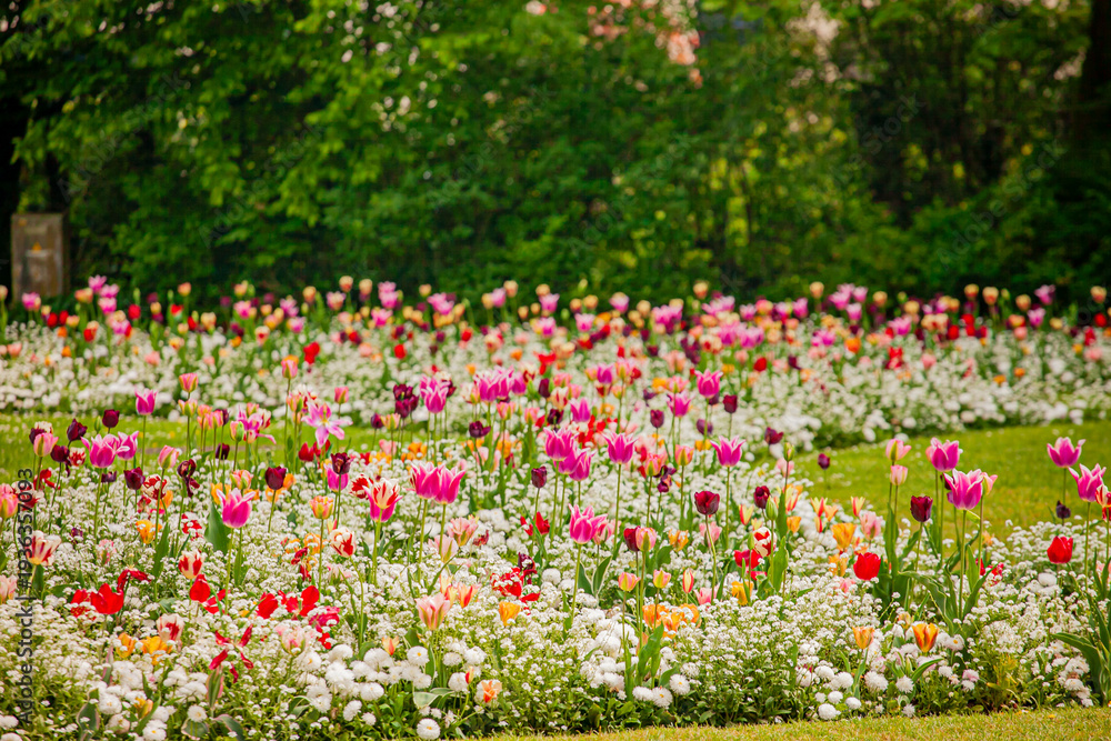 Obraz Pejzaże - Colorful tulip garden blooms vibrantly under the warm sun amidst lush green surroundings #1936357093