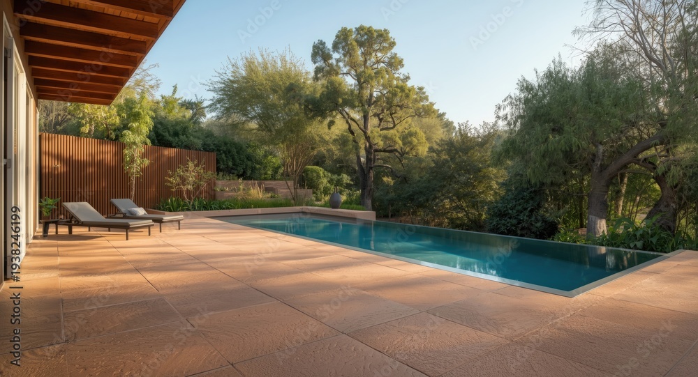 • Well designed terrace with textured concrete tiles and a peaceful blue pool amid natural foliage