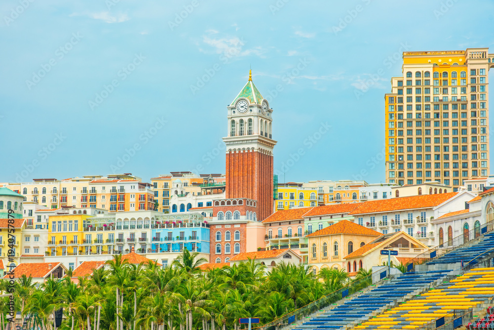 Obraz Pejzaże - Colorful mediterranean style resort buildings and clock tower with palm trees in Sunset Town, Phu... #1940757879