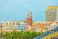 • Colorful mediterranean style resort buildings and clock tower with palm trees in Sunset Town, Phu Quoc island, Vietnam. Coastal resort development and tourism infrastructure