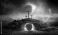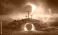 • Crucifixion of Jesus Christ in Hill At Sunset And Empty Tomb With Rolled Stone With Abstract Lights Flare Effects