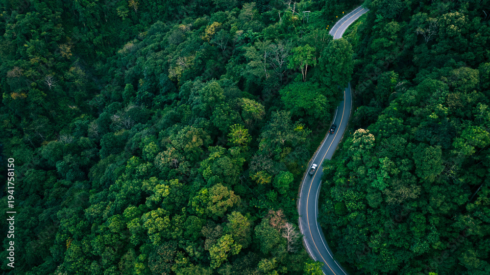Obraz Pejzaże - Green tropical forest with winding road and cars driving through nature. Strong visual metaphor... #1941758150