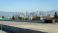• Downtown LA skyline viewed from the 110 freeway with mountains behind under clear blue sky