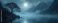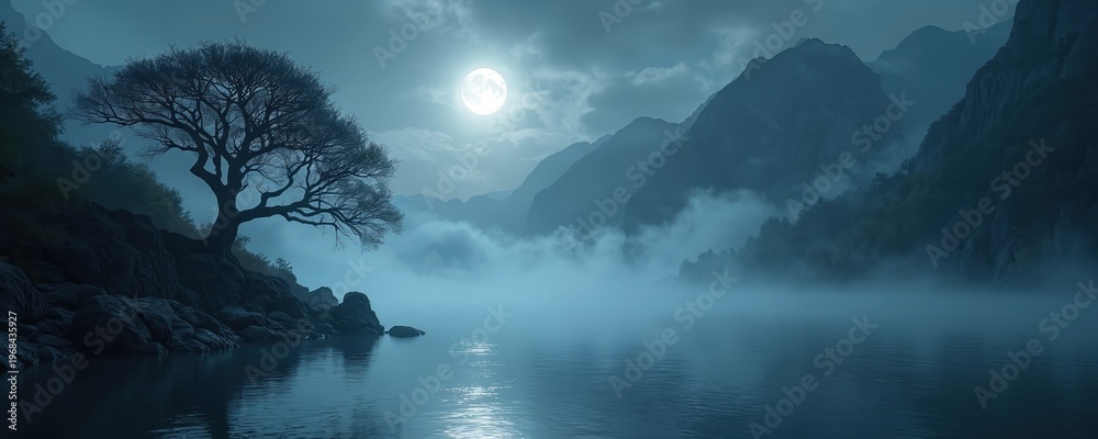 • Misty mountain lake scene under full moon. Bare tree on rocky shore. Fog rolls over water and hills. Serene night landscape with dark silhouette. Peaceful atmosphere.