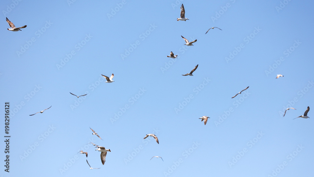 Obraz Pejzaże - A flock of seagulls flying in the sky #1982916121