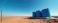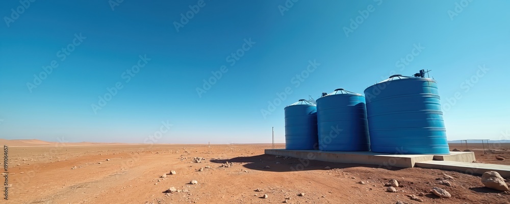 • Large blue water tanks sit in barren desert landscape under clear sky. Industrial storage silos contrast sharply with arid, empty surroundings, suggesting vital resource management in dry region.