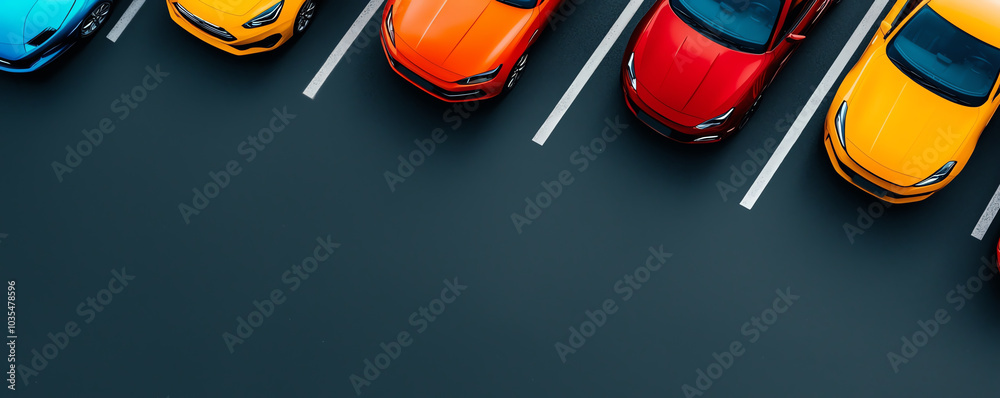 Obraz Pojazdy - Aerial image of a busy parking lot, bright colorful cars forming a striking geometric arrangement #1035478596