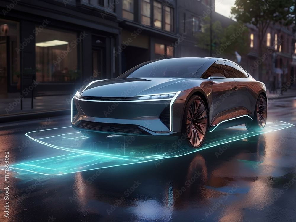 Obraz Pojazdy - Self-driving car with neon lights under the car, moving along a city street #1171368052