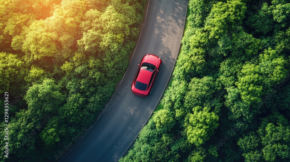 Obraz Pojazdy - A car on an elevated road cutting through the dense, dark green forest. Serene journey,... #1298353621