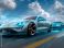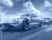 • Futuristic sports cars with glowing digital wireframes racing on highway under dramatic cloudy sky and blue neon motion trails
