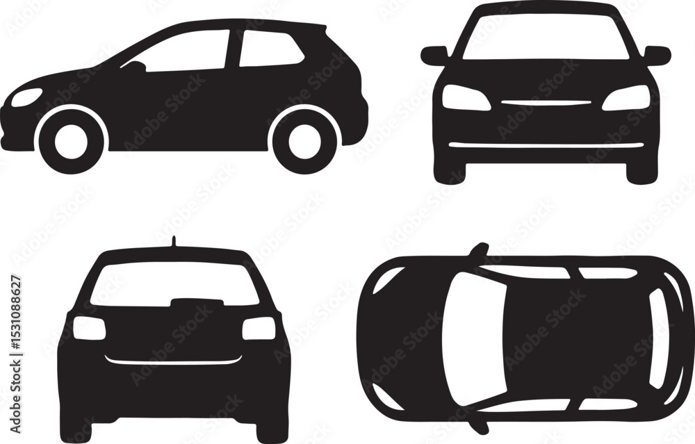 • Car silhouette icons set side, front, back, and top views vector art illustration.