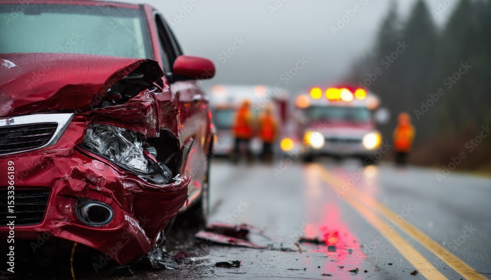 • a heavily wrecked red car in rainy weather, parked on roadside after accident, broken front bumper and crushed headlights, emergency team and ambulance in background