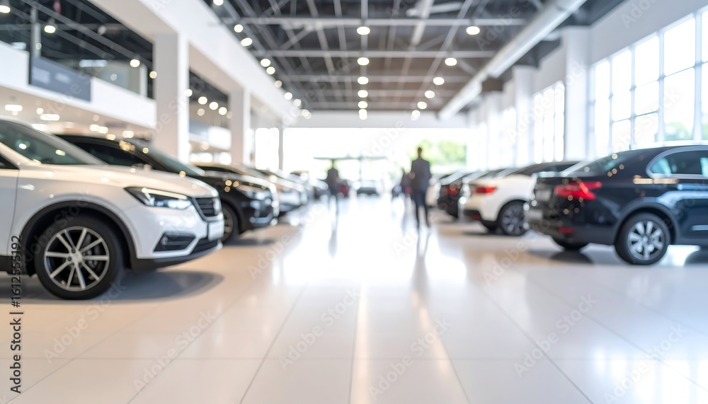 • Blurred view of a spacious car showroom with rows of vehicles and people walking