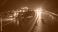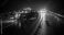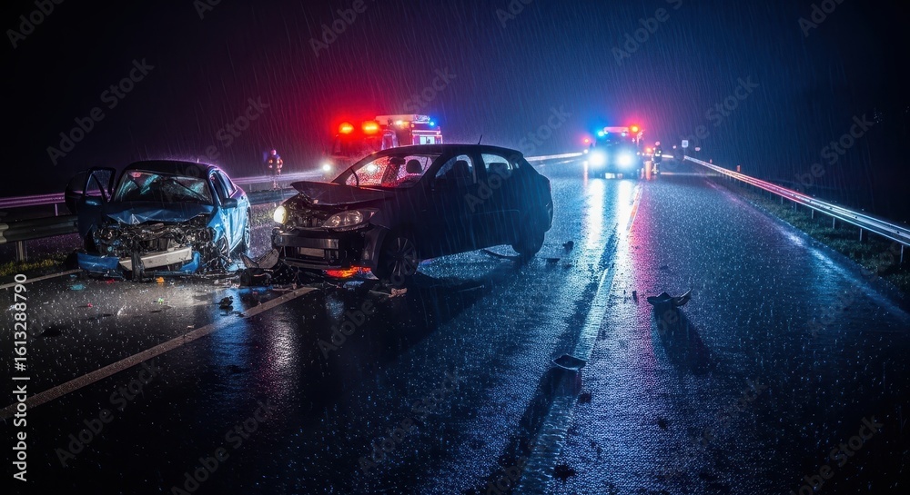 • Nighttime highway collision with two wrecked cars and emergency services lights in the rain