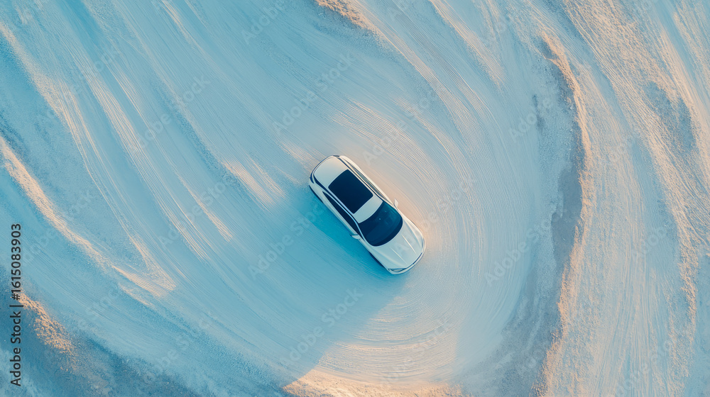 Obraz Pojazdy - Top-down view of a sleek white automobile navigating a vast, artistic desert terrain with... #1615083903