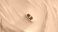 • Top-down view of a sleek white automobile navigating a vast, artistic desert terrain with wind-sculpted ripples, representing serene exploration and journey, ideal for automotive advertisement.