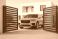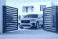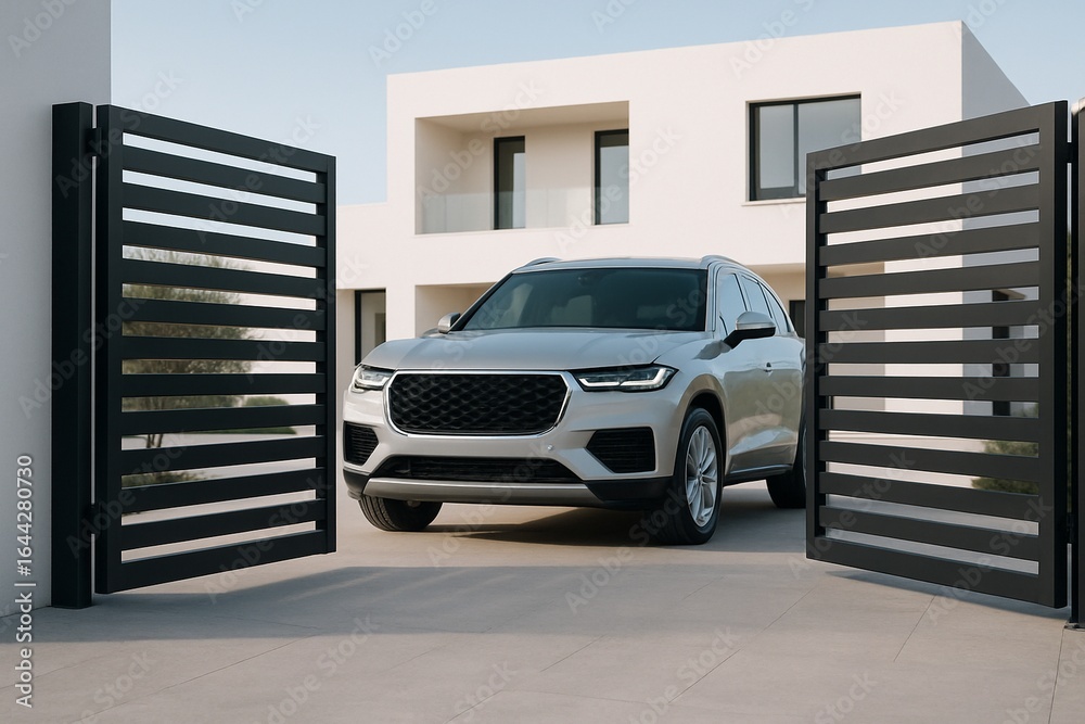 Obraz Pojazdy - Modern car exiting contemporary home through automatic gate #1644280730