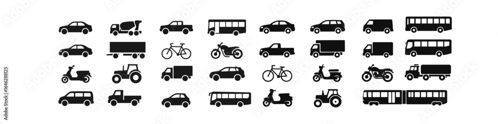 Obraz Pojazdy - Silhouette icons of diverse transportation vehicles: cars, bikes, and more #1646288125