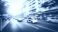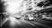 • A futuristic compact car drives through a bustling city street at sunset, surrounded by motion-blurred vehicles and urban architecture.