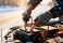 Obraz Pojazdy - Winter car maintenance concept: gloved hands attaching jumper cables to a battery for emergency... #1752701599