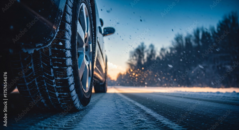 Obraz Pojazdy - Car wheel with snow on a winter tire driving on a slippery road at night. Dangerous driving... #1757654676