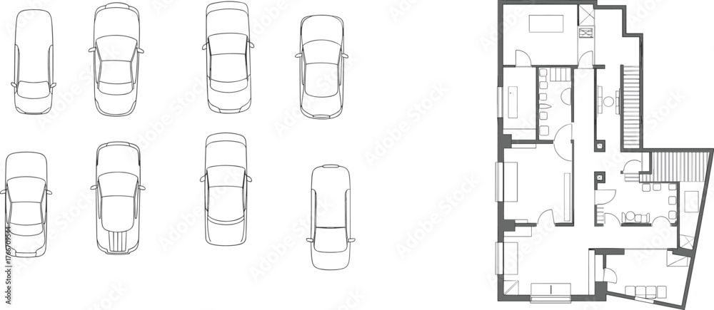 Obraz Pojazdy - CAD drawing flat vector, car parking grid illustration, architectural building floor plan, top... #1766709544