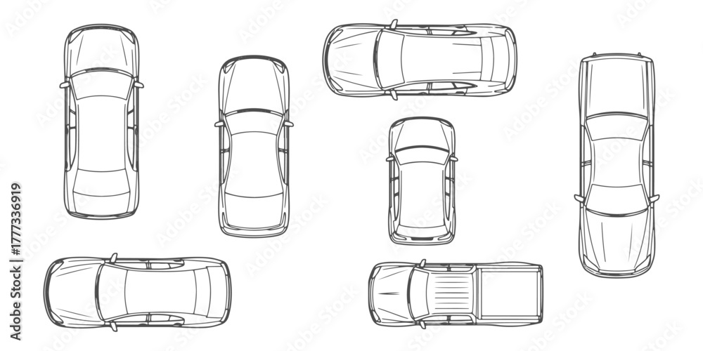 • CAD Drawings. Top view of various cars isolated on white background. Vector illustration.
