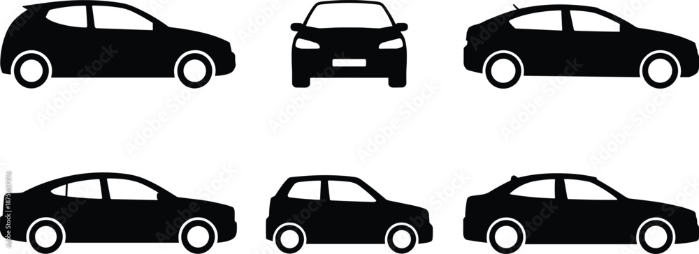 Obraz Pojazdy - Set of 6 car silhouette icons including hatchback, sedan, and compact styles, ideal for... #1875657976