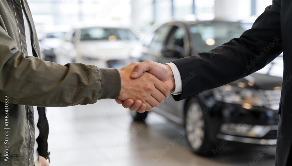 Obraz Pojazdy - Closeup handshake between customer and sales representative in car dealership showroom vehicle... #1887410337