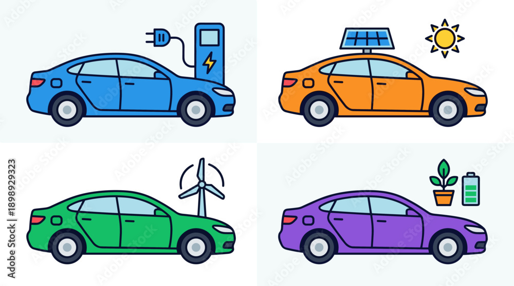 • Set of four flat vector illustrations showing electric sedan cars with sustainable energy sources: electric charging, solar power, wind energy, and eco-friendly green battery technology.