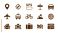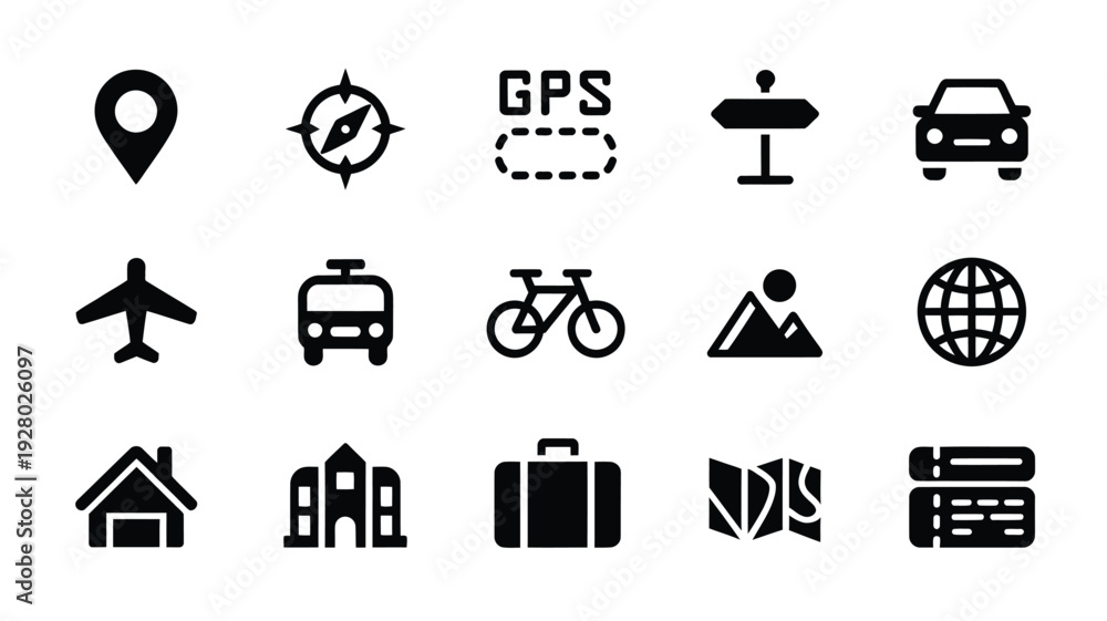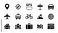 • Collection of black travel and transportation icons on a white background