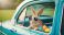 • Easter bunny on the go cool rabbit wearing sunglasses in a vintage teal car with colorful easter eggs on a sunny day