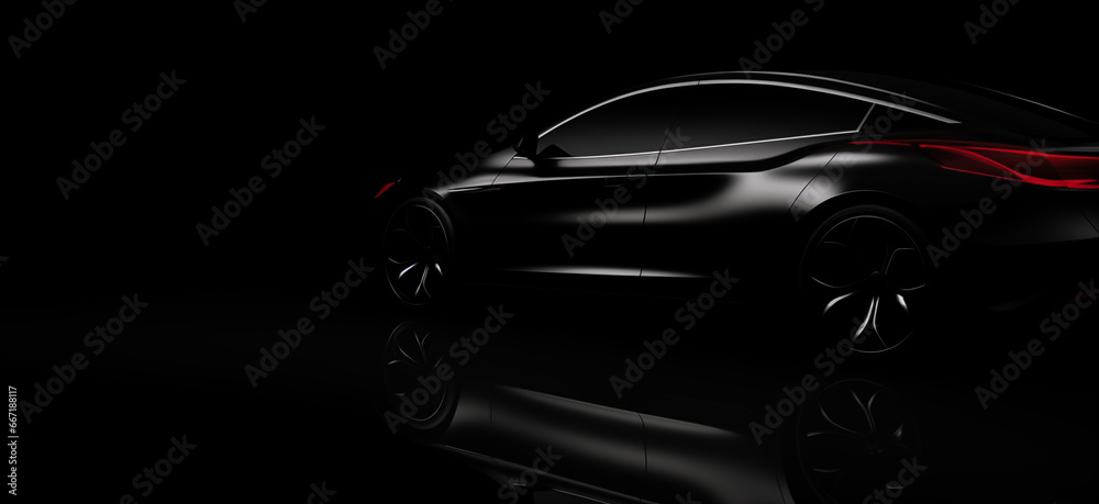 Obraz Pojazdy - Black sports car. Generic brandless black car with reflection, side view. copy space. #667188117