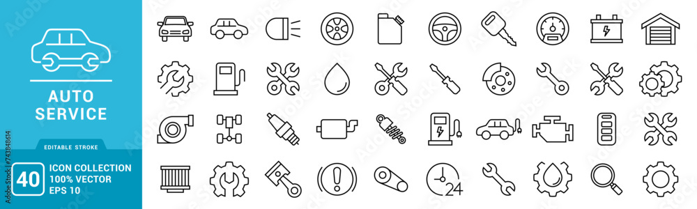 • Collection of auto service icons, machine, garage, workshop, vehicle, car, vector icons editable stroke and resizable EPS 10.
