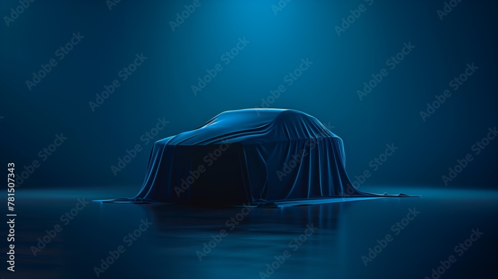 • Luxurious car draped in fabric, unveiled in dark studio, 3D rendering. Expensive gift, realistic blue presentation.