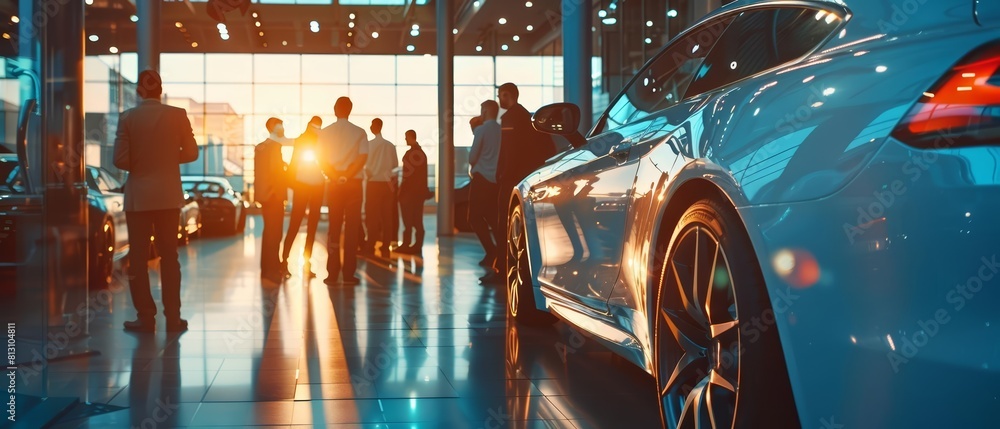 • Team of skilled workers gathered at a car dealership, discussing strategies beside a shiny new car under bright showroom lights