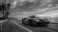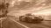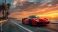 • Sleek red sports car driving on a coastal road lined with palm trees during a vibrant sunset, showcasing speed and elegance