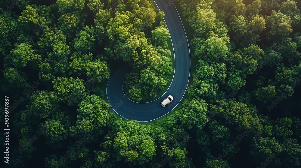 Obraz Pojazdy - Aerial top view of a car driving through a winding forest road, Winding road through the forest.... #909697837