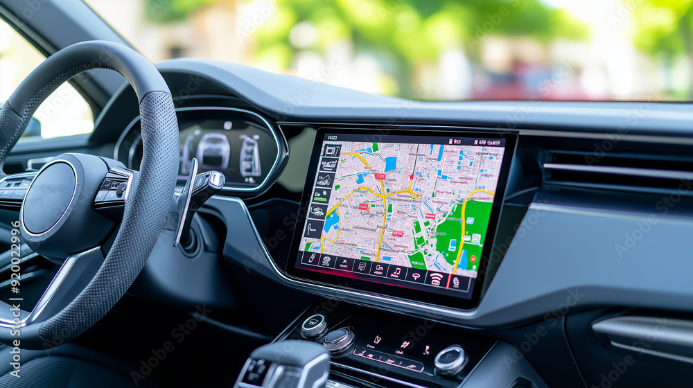 Obraz Pojazdy - Car navigation system. GPS map on a car dashboard. Modern car interior. #920022996